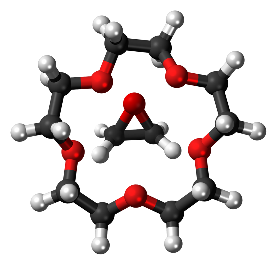 File created from File:15-Crown-5-3D-balls.png by User:Jynto and File:Ethylene-oxide-from-xtal-3D-balls.png by User:Benjah-bmm27 with the Linux Gimp editor. / Ball-and-stick models of the crown ether 15-crown-5 and its monomer (ethylene oxide).